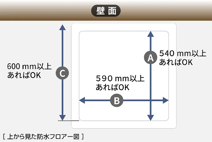 洗濯機のサイズが洗濯パンよりも大きい場合ははみ出るので、場合によっては設置場所の壁にぶつかる場合がある事に注意。