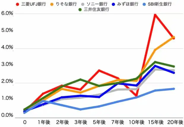 - 変動金利 0.38%が固定金利の 1.85%に追いつく、つまり 1.47%上昇するには 6 回のの金利上昇が必要と推測されている。